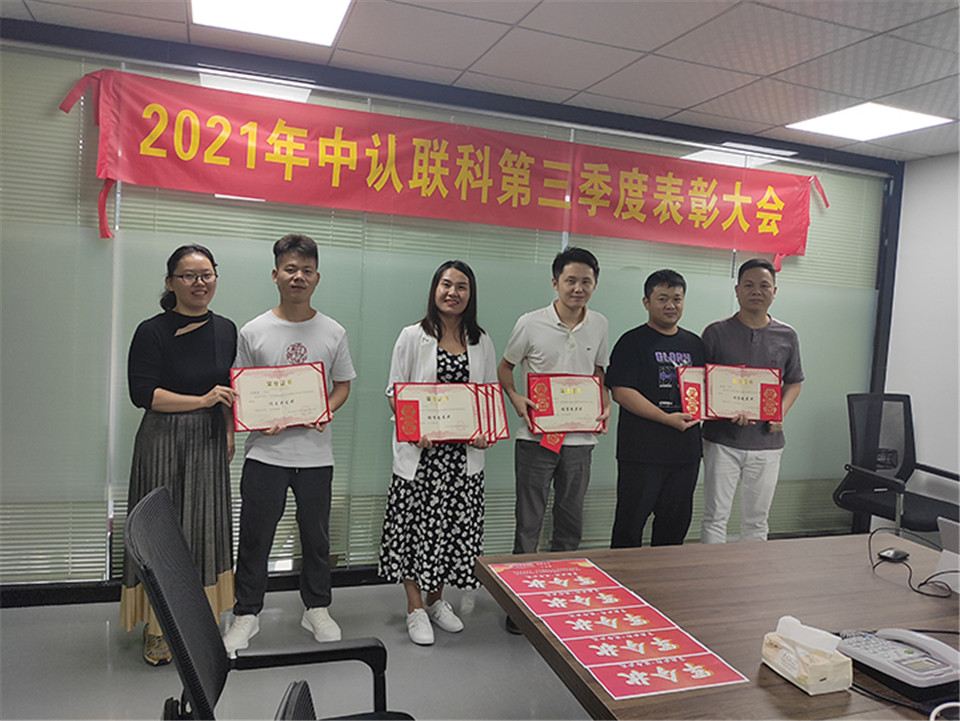 為增強公司員工的內部凝聚力,提升公司的企業形象及競爭力,中認聯科檢測技術有限公司于10月16日下午4點,在東莞會議室舉行了2021年中認聯科第三季度表彰大會。銷售部全體員工和領導參與了本次會議。