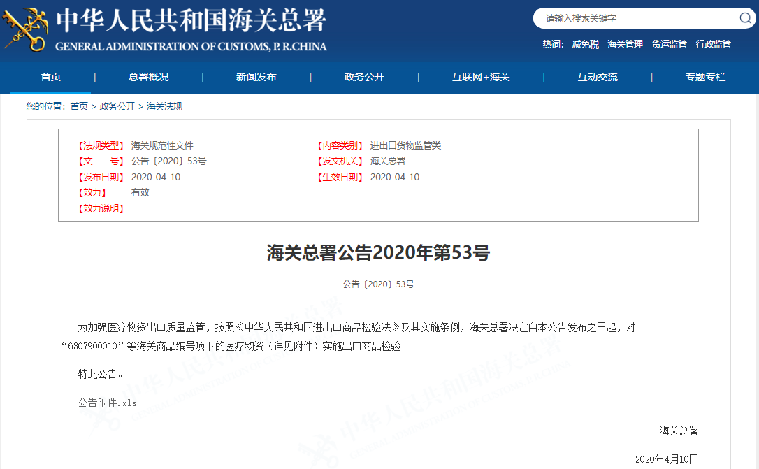 中華人民共和國海關總署于4月10日,正式通過其官方網站發布2020年第53號公告!自該公告發布之日起,對“6307900010”等海關商品編號項下的醫療物資實施出口商品檢驗。