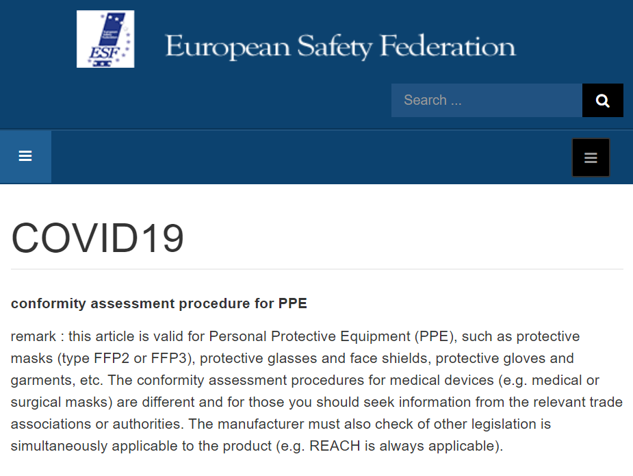 近日,歐洲安全聯盟(European Safety Federation)在其官方網站上發布文章對當前一些個人防護用品(PPE) 的CE證書進行“打假”的同時還表示,防護口罩(FFP2或FFP3型)、防護眼鏡和面罩、防護手套和防護服裝等個人防護用品(PPE)除了要滿足當前聚焦的CE認證以外,也必須要滿足REACH法規。