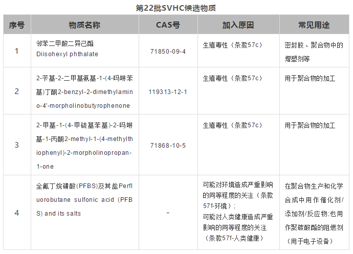 歐洲化學(xué)品管理局(ECHA)于2020年1月16日公布了新一批高關(guān)注物質(zhì),之前咨詢清單上的4項(xiàng)物質(zhì)全部加入了候選清單。 其中鄰苯二甲酸二異己酯、2-芐基-2-二甲基氨基-1-(4-嗎啉苯基)丁酮、2-甲基-1-(4-甲硫基苯基)-2-嗎啉基-1-丙酮由于生殖毒性,而全氟丁烷磺酸(PFBS)及其鹽由于其多種特性,被加入到SVHC候選物質(zhì)清單中。至此SVHC候選物質(zhì)清單共包括22批205種物質(zhì)。 中認(rèn)聯(lián)科提醒企業(yè)在生產(chǎn)或進(jìn)口這些物質(zhì)以及含有這些物質(zhì)的產(chǎn)品時(shí)需要根據(jù)候選清單明確它的潛在義務(wù)。